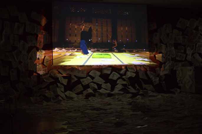 映像と実空間に共存する和紙と身体を用いて、展示空間と映像の関係性を探りました。